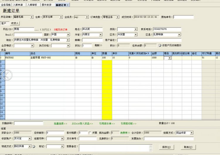 对于不通过API下载的,可以选择网店管家系统中的销售->新建订单菜单进入新建订单界面,界面如下: