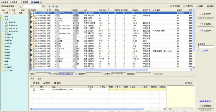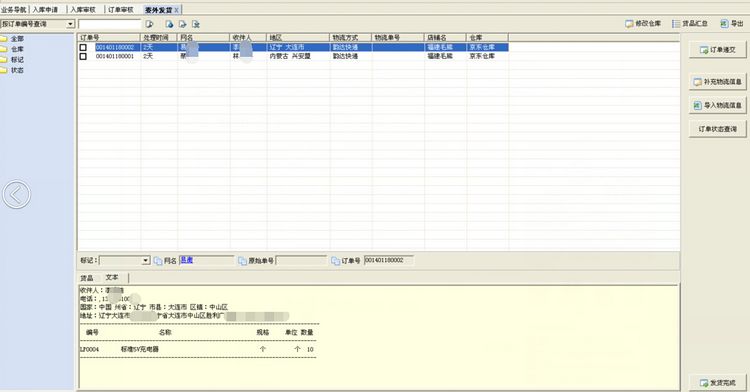 选择网店管家系统中的销售->订单审核菜单进入订单审核界面,选择订单,点[审核完成]按钮,完成审核操作进入委外发货环节,界面如下: